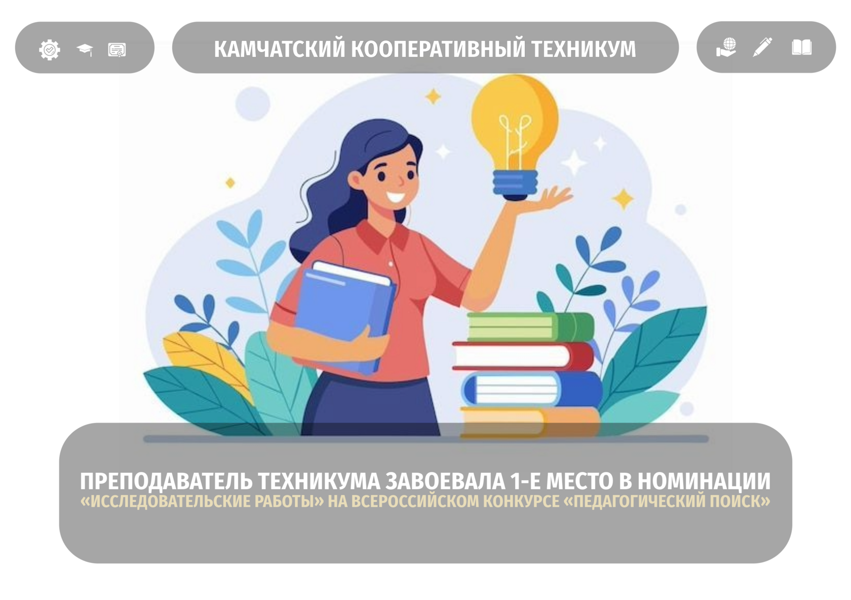 Громова Татьяна Юрьевна, преподаватель кафедры общеобразовательных и социально‑гуманитарных дисциплин Камчатского кооперативного техникума, завоевала 1‑е место в номинации «Исследовательские работы» на VI Всероссийском конкурсе с международным участием «Педагогический поиск»!